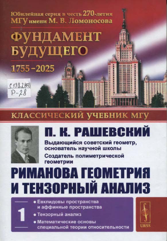 Риманова геометрия и тензорный анализ / Петр Константинович Рашевский. – 8-е изд., обновл. – М. : URSS, 2025. – (Юбилейная серия в честь 270-летия МГУ имени М. В. Ломоносова)(Фундамент будущего: Классический учебник МГУ). – ISBN 978-5-9710-9362-6.